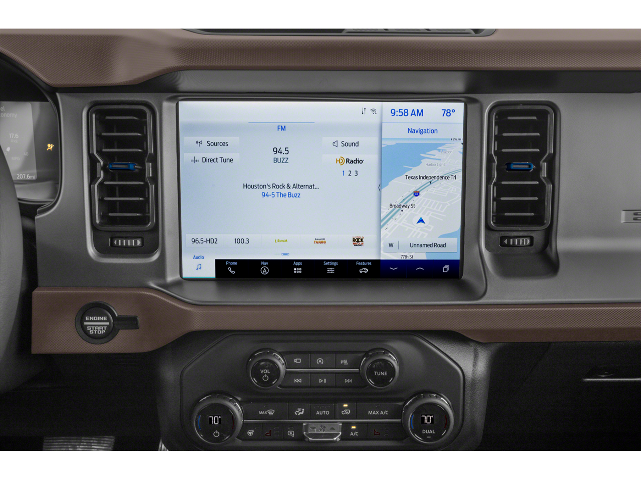 Beyond these eye-catching elements, this Bronco boasts a wealth of advanced technology and convenience features to enhance your driving experience. Enjoy the seamless connectivity of the SYNC 4 system, the added security of the 911 Assist emergency communication system, and the effortless control of the steering wheel-mounted audio controls.