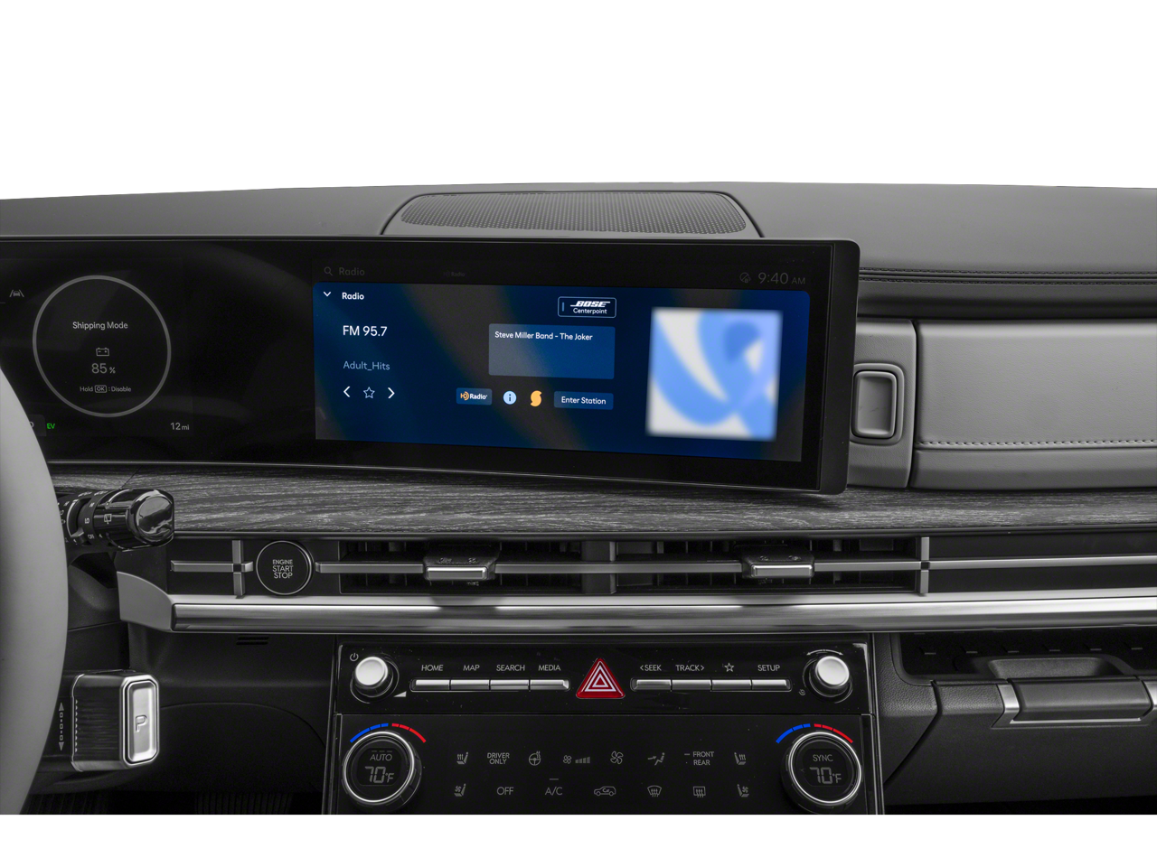 • Radio: AM/FM/HD Bose Premium Audio System -inc: 12 speakers including subwoofer, external amplifier, 12.3" wide touchscreen, Apple CarPlay and Android Auto, Bluetooth® hands-free w/wireless audio streaming, dynamic voice recognition, USB connectivity, SiriusXM, wifi hotspot, Blue Link connected car system, navigation system including traffic flow w/incident data via HD Radio (HERE), OTA updates (map only) and rear seat quiet mode