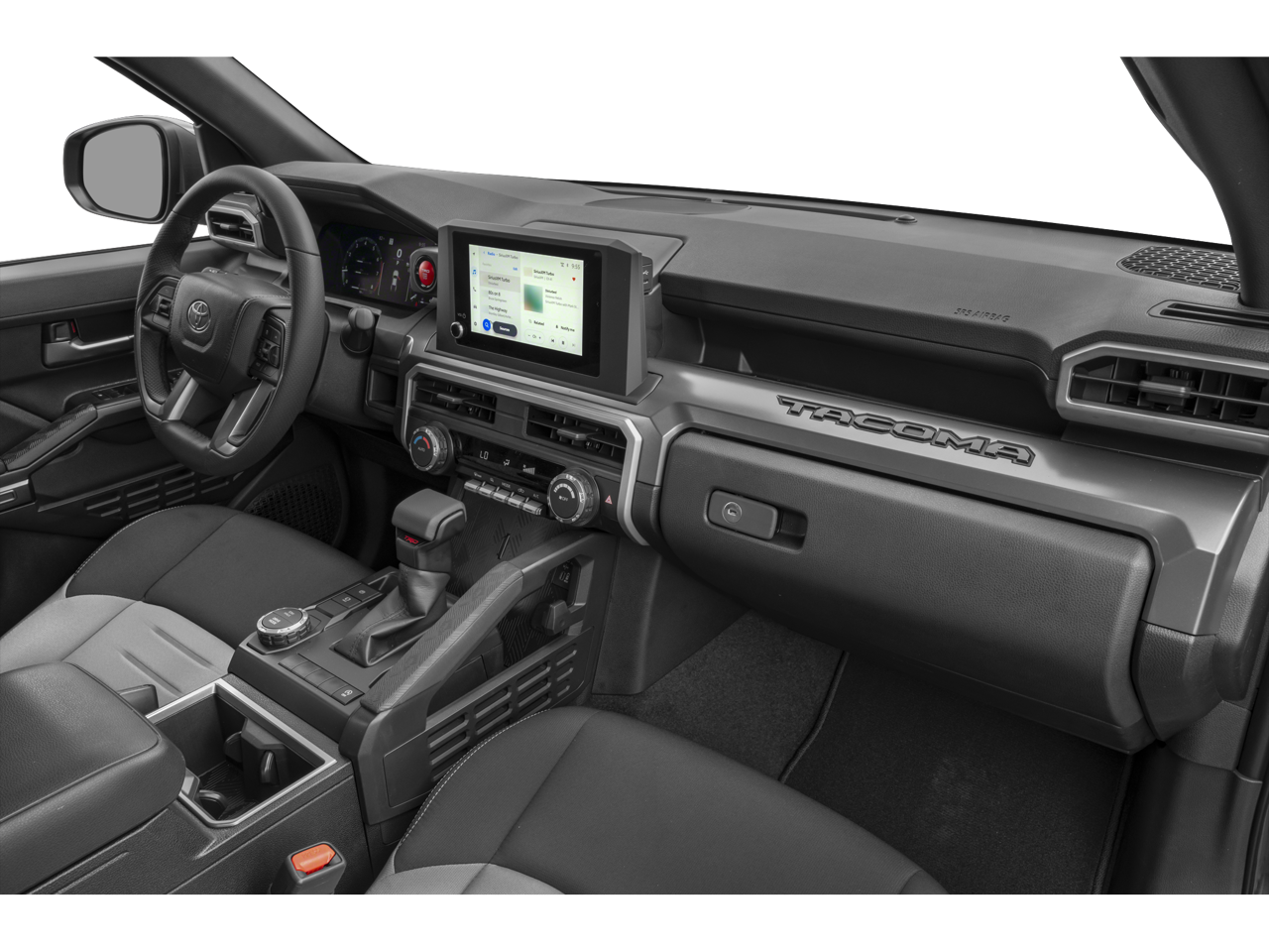 Step inside the Tacoma TRD Sport and you'll be greeted by a spacious and well-appointed interior. The fabric seat trim and leather-wrapped steering wheel provide a premium feel, while the split-folding rear seat offers versatile cargo-carrying capabilities. Stay connected and in control with the steering wheel-mounted audio controls and the auto-dimming rearview mirror.
